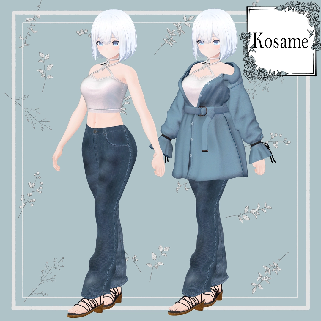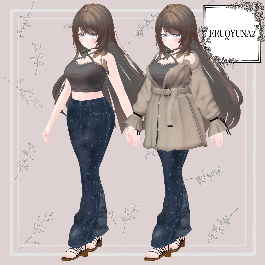 ・VRCSDK3・ポリゴン数:△44,956 ※全アイテム合計 ※アバターによって前後します・shader:liltoon(ver 1.7.0) ※Materialはliltoon 1.7.0からのRimshade機能を反映しています・shape key: 胸の大小対応しています。 (Breasts_big 0∼100、Breasts_small 0∼100等) ※Breast bigとsmall等でオブジェクトを分割している場合があります、使用しないものは消去ください ※Breast Smallやflatにする場合は胸揺れのPhysics Boneをオフにしてください ※移動時の太もも部や、過度な動き(足や腕を大きく曲げたときなど)の貫通はご容赦ください