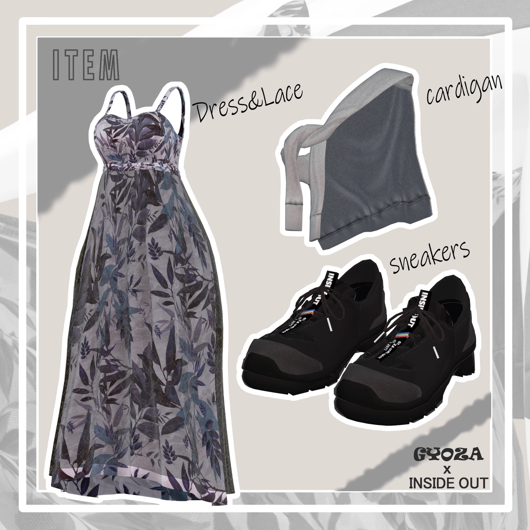 1 Camisole Dress ※PB attached near the lower leg area of the skirt2 Lace ※PB attached near the lower leg area of the skirt3 Shoulder Wrap Cardigan ※PB attached to sleeves and hem4 Sneakers ※PB attached to laces