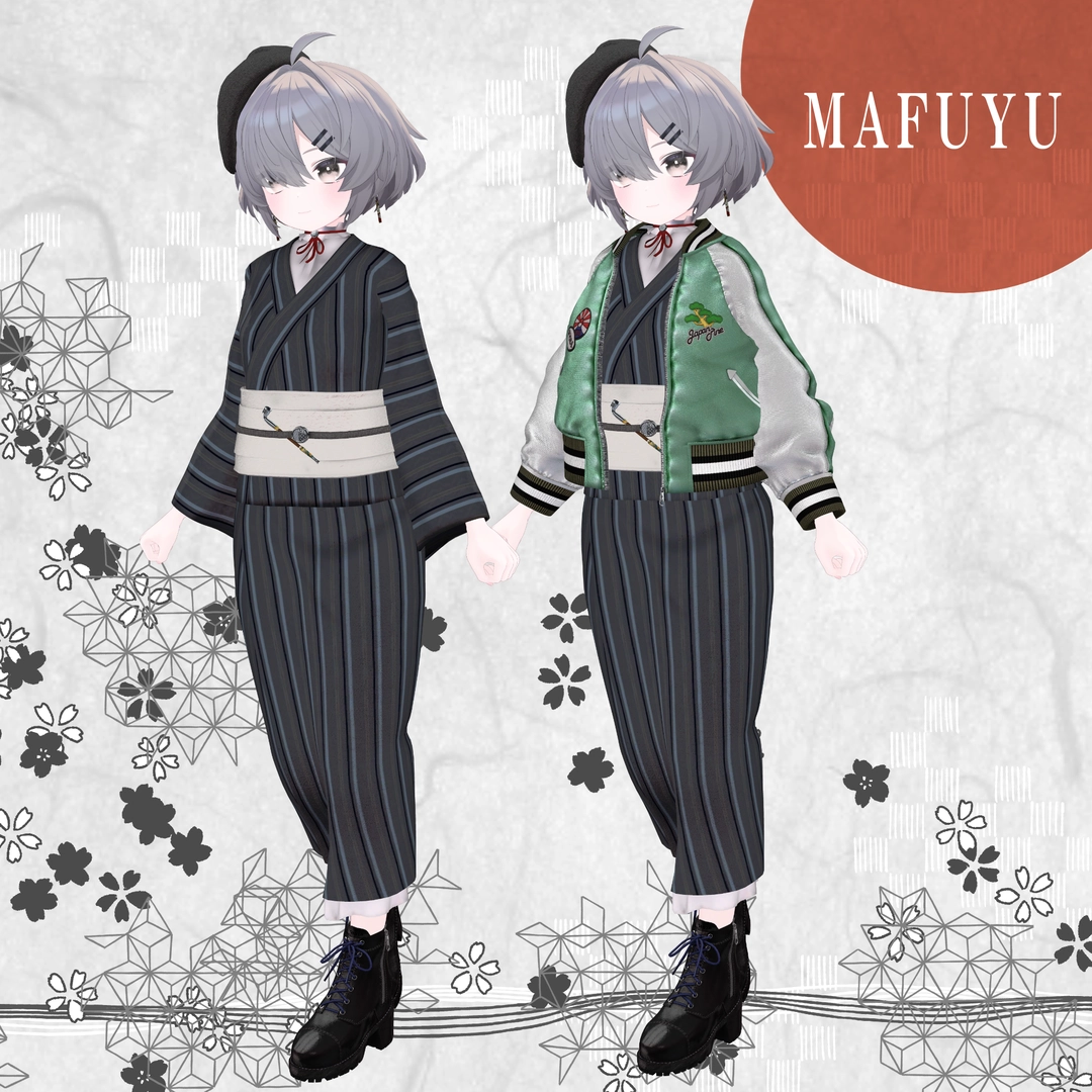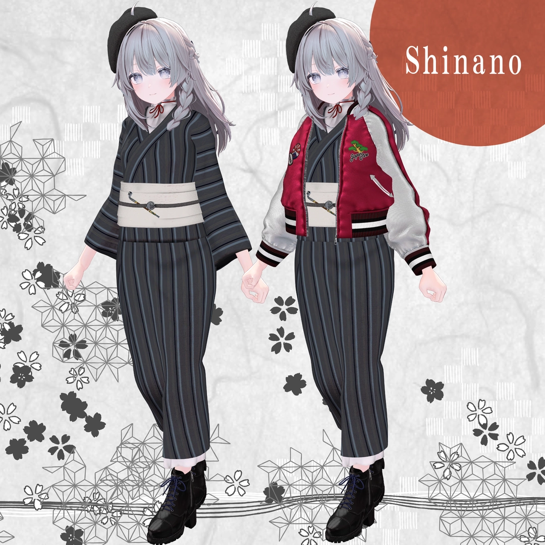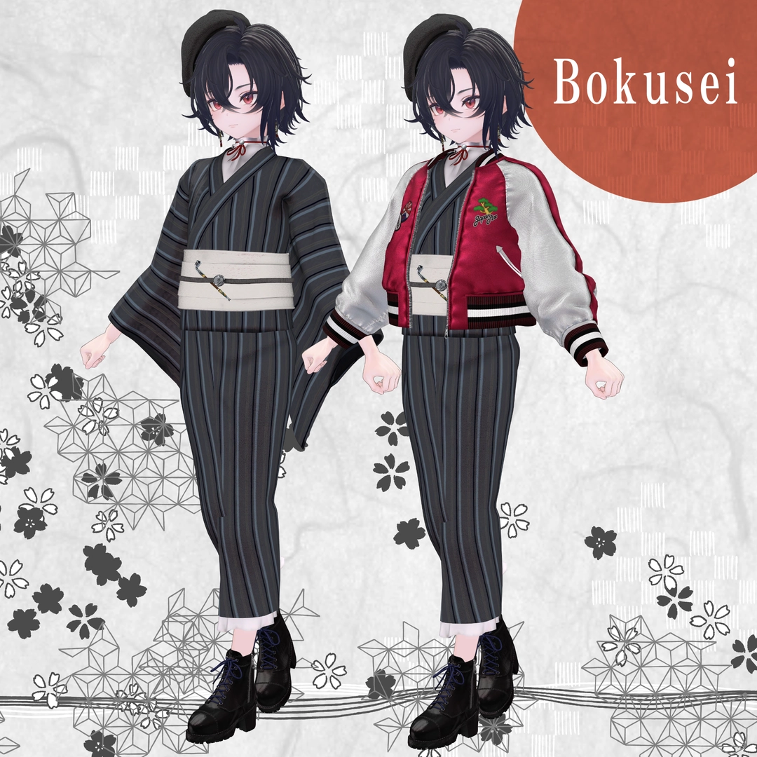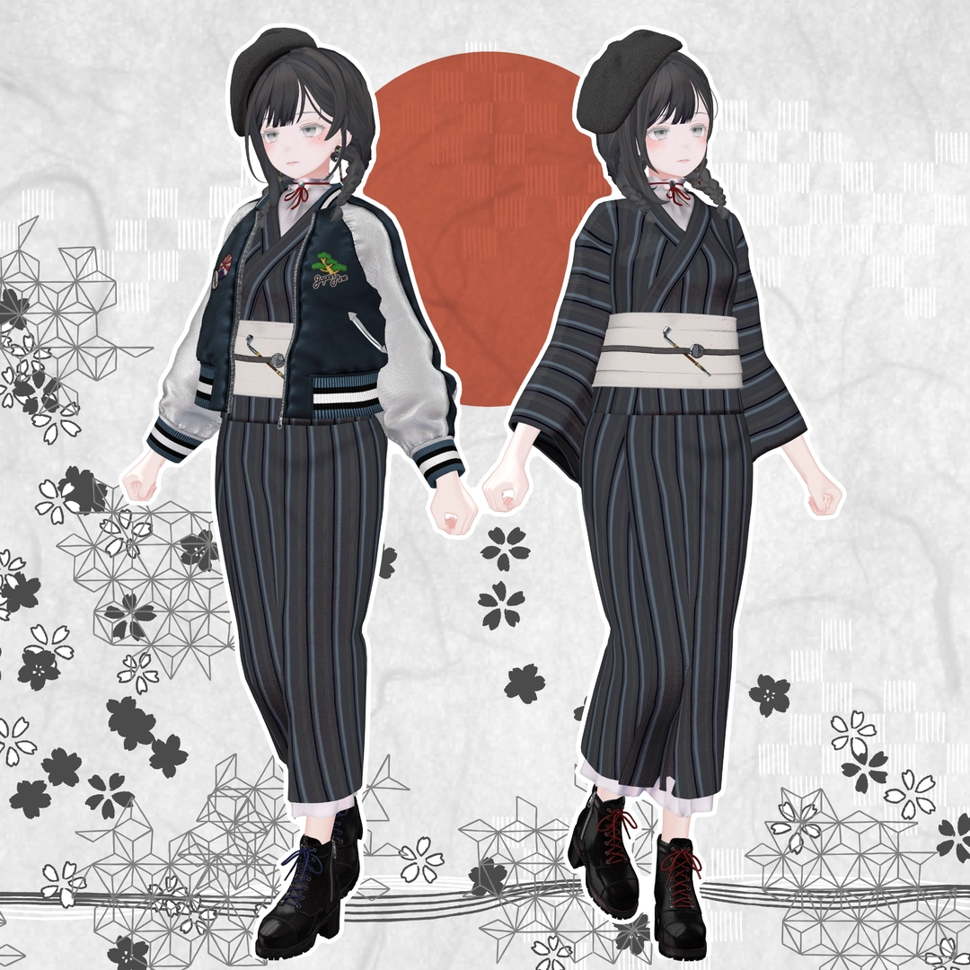 1.スカジャン2.浴衣(上)※袖有り無しverあり3.浴衣(下)4.帽子5.イヤリング6.帯7.帯部のキセル8.ブーツ9.キセル単体