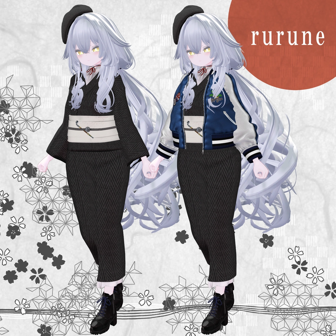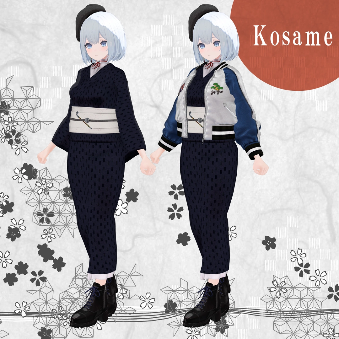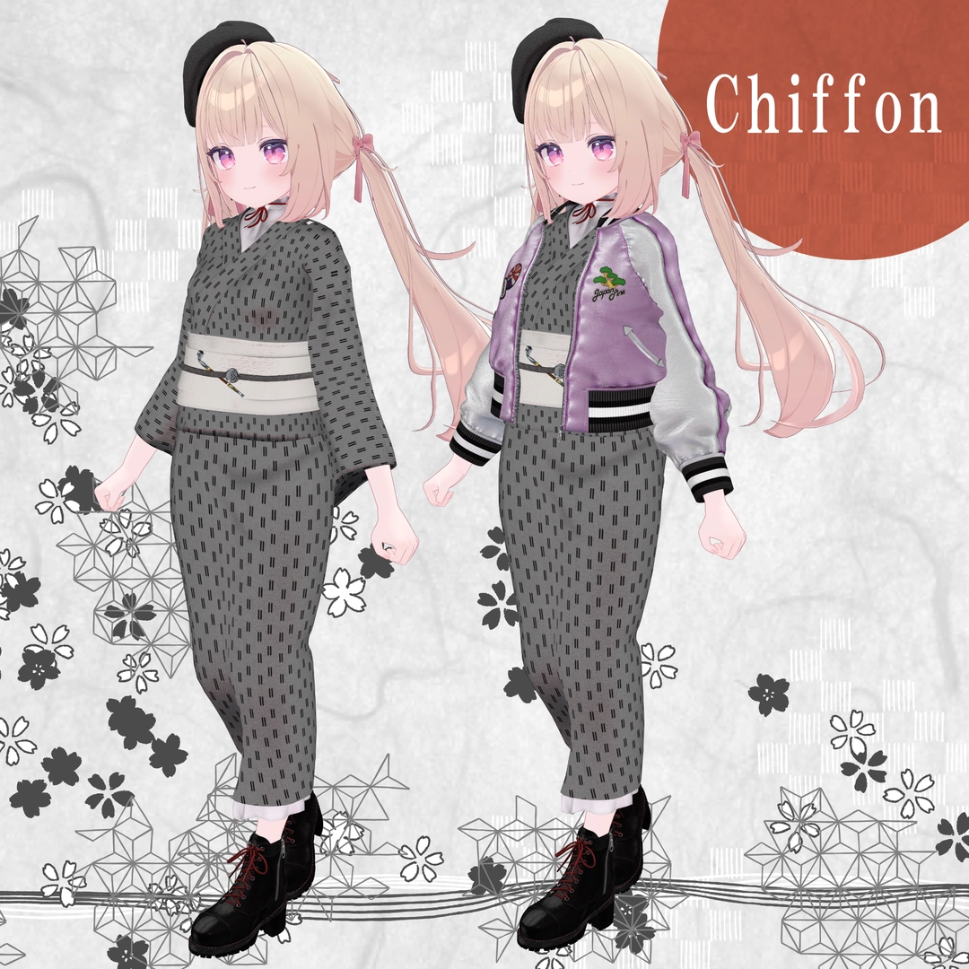 1.スカジャン2.浴衣(上)※袖有り無しverあり3.浴衣(下)4.帽子5.イヤリング6.帯7.帯部のキセル8.ブーツ9.キセル単体