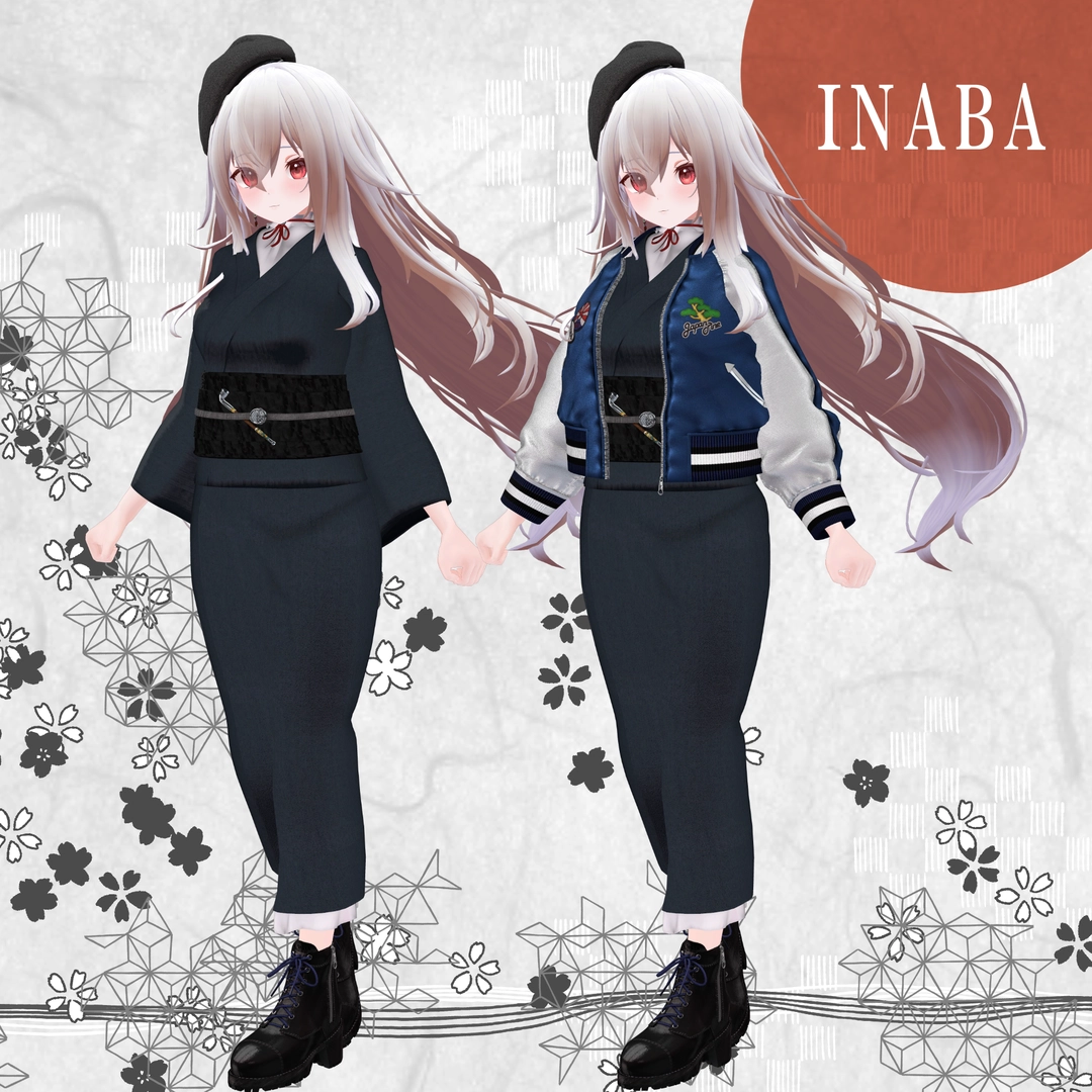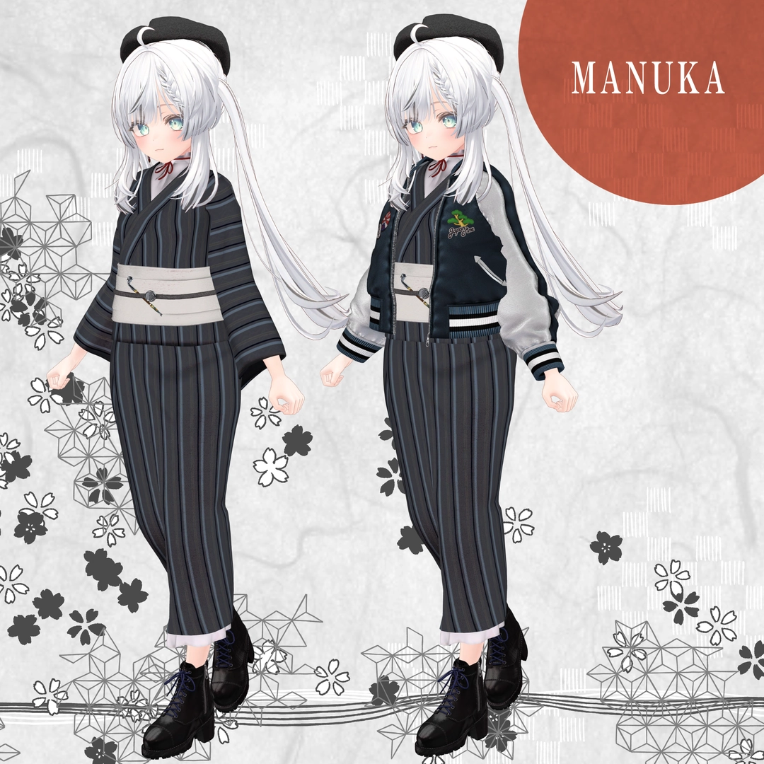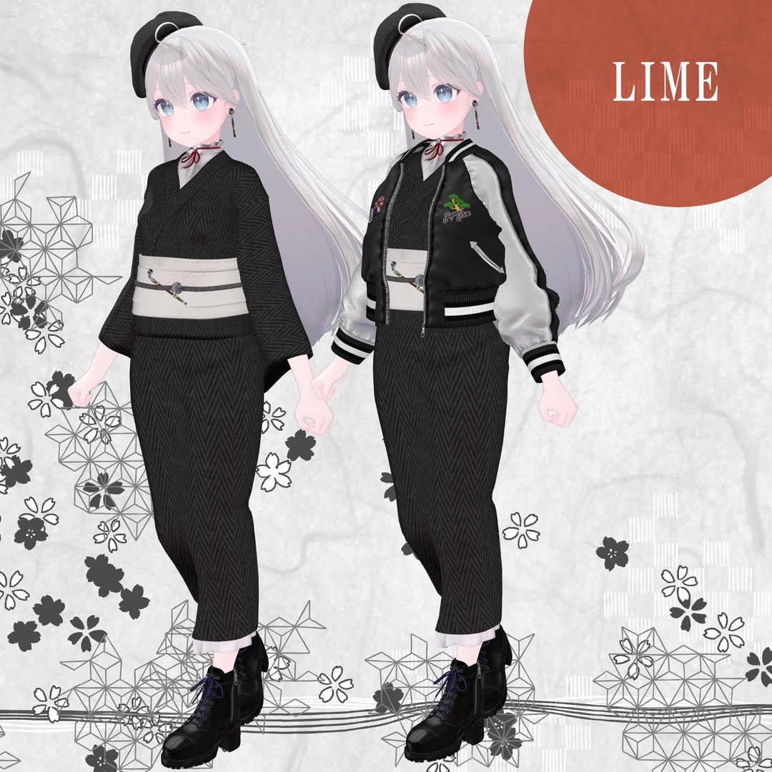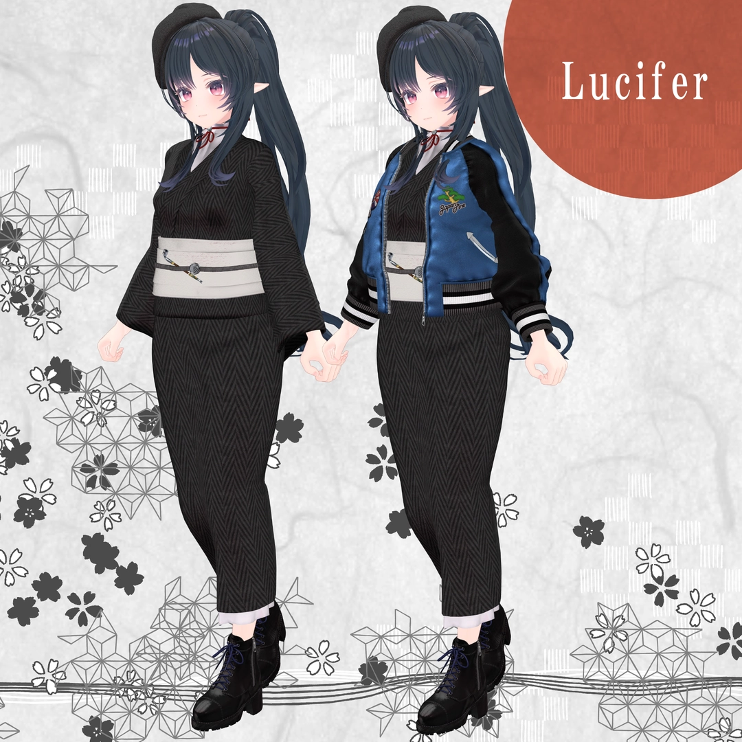 1.スカジャン2.浴衣(上)※袖有り無しverあり3.浴衣(下)4.帽子5.イヤリング6.帯7.帯部のキセル8.ブーツ9.キセル単体