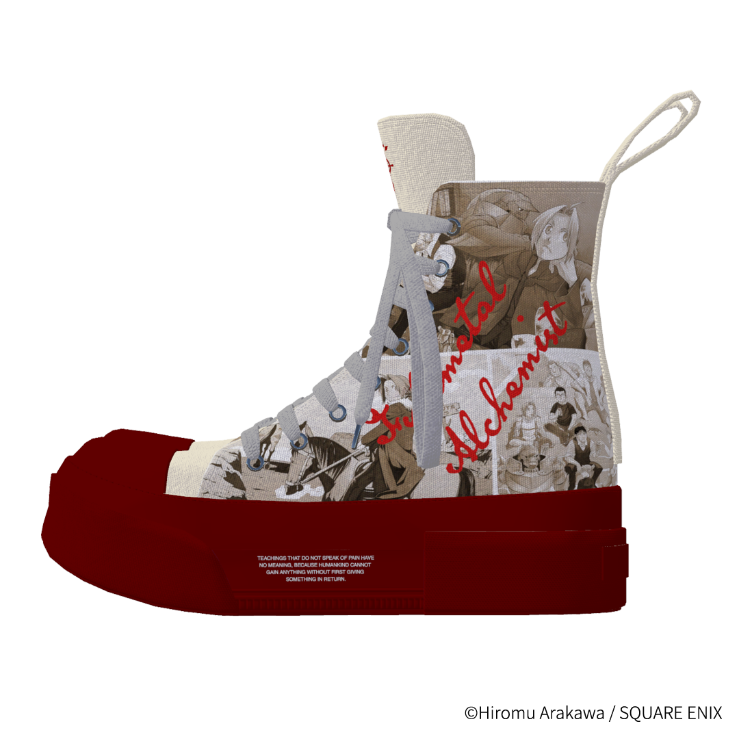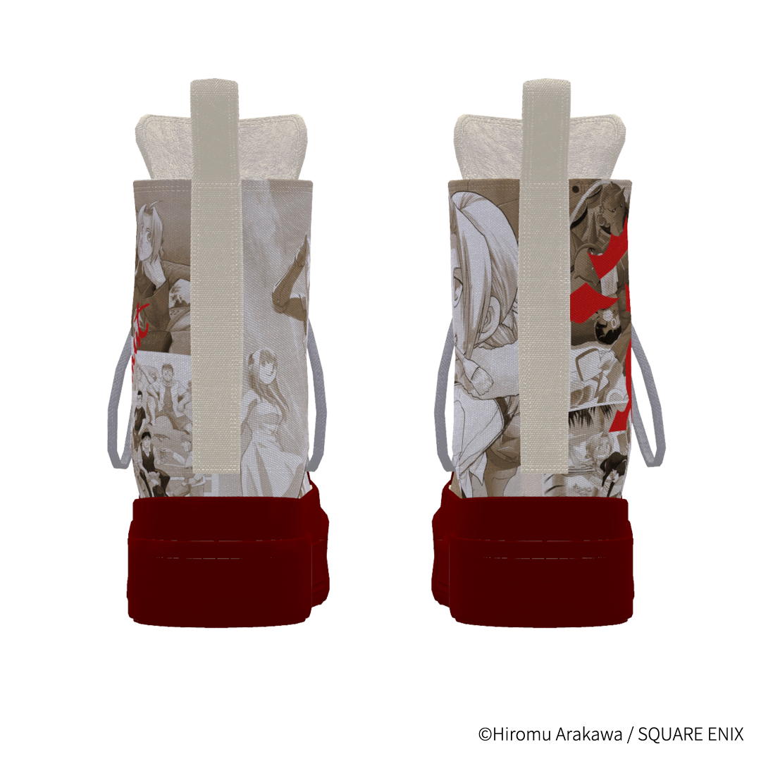 エドワードやアルフォンス達の日常のワンシーンを、 ワントーンのフォトスナップのようにコラージュしたハイカットスニーカー