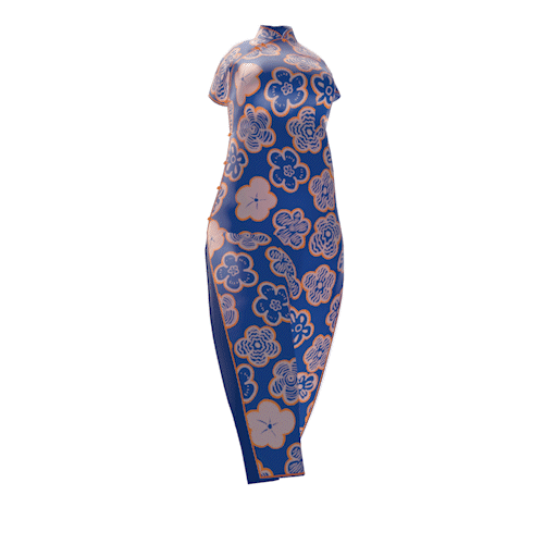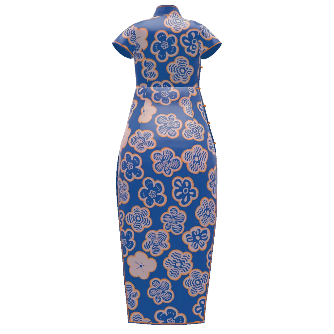 オレンジのパイピングが効いたポップなフラワーモチーフのチャイナ服