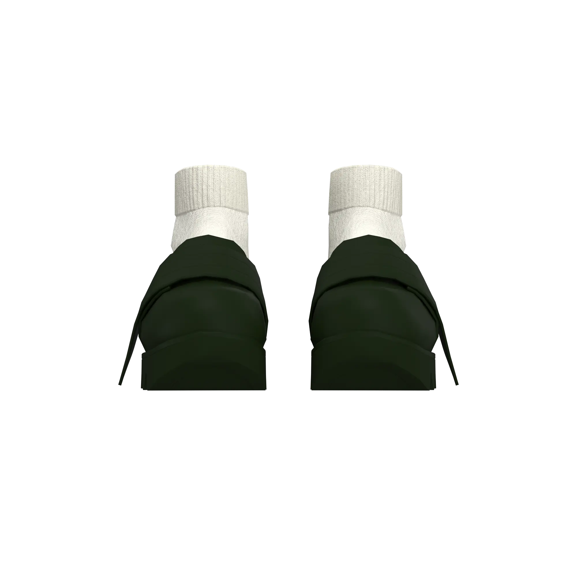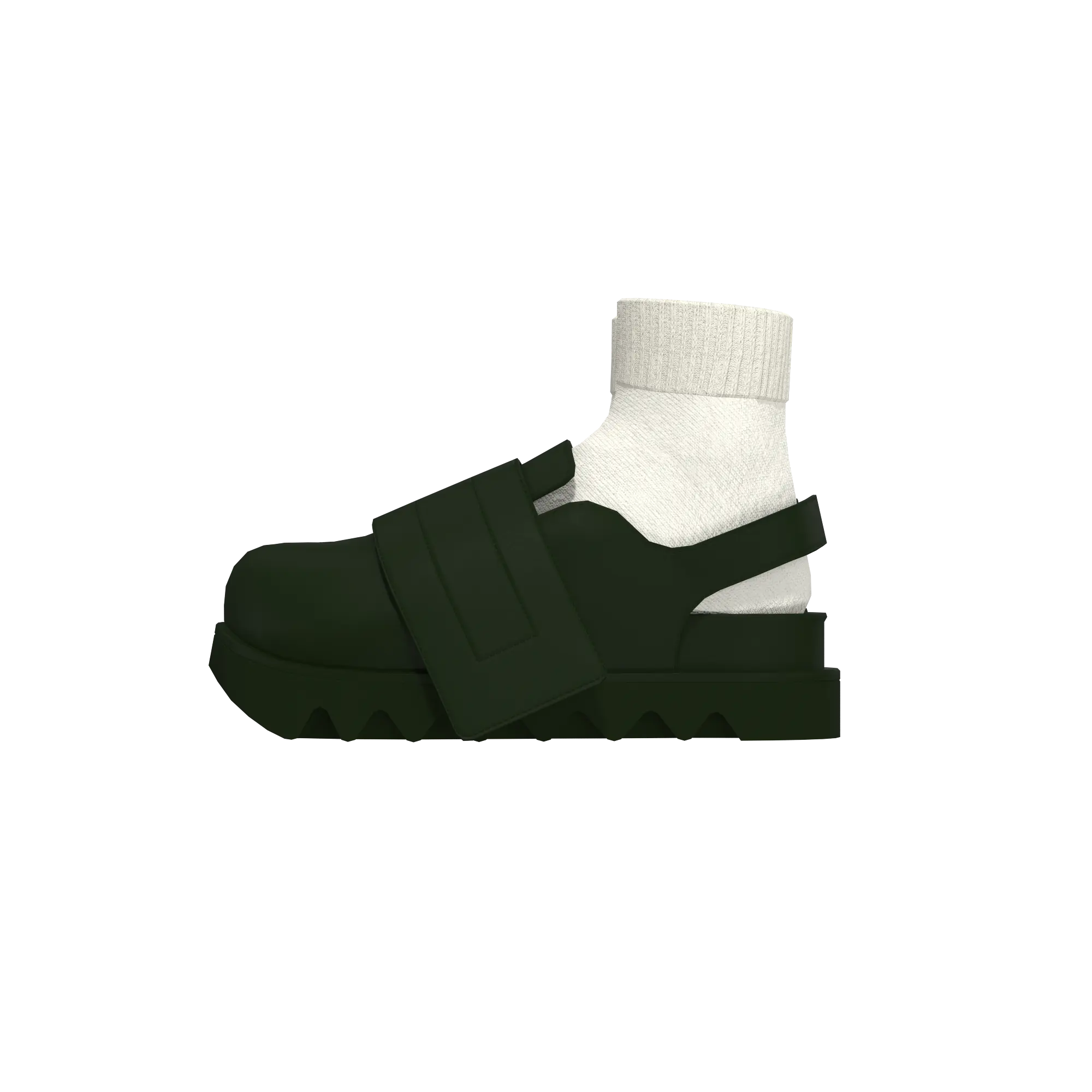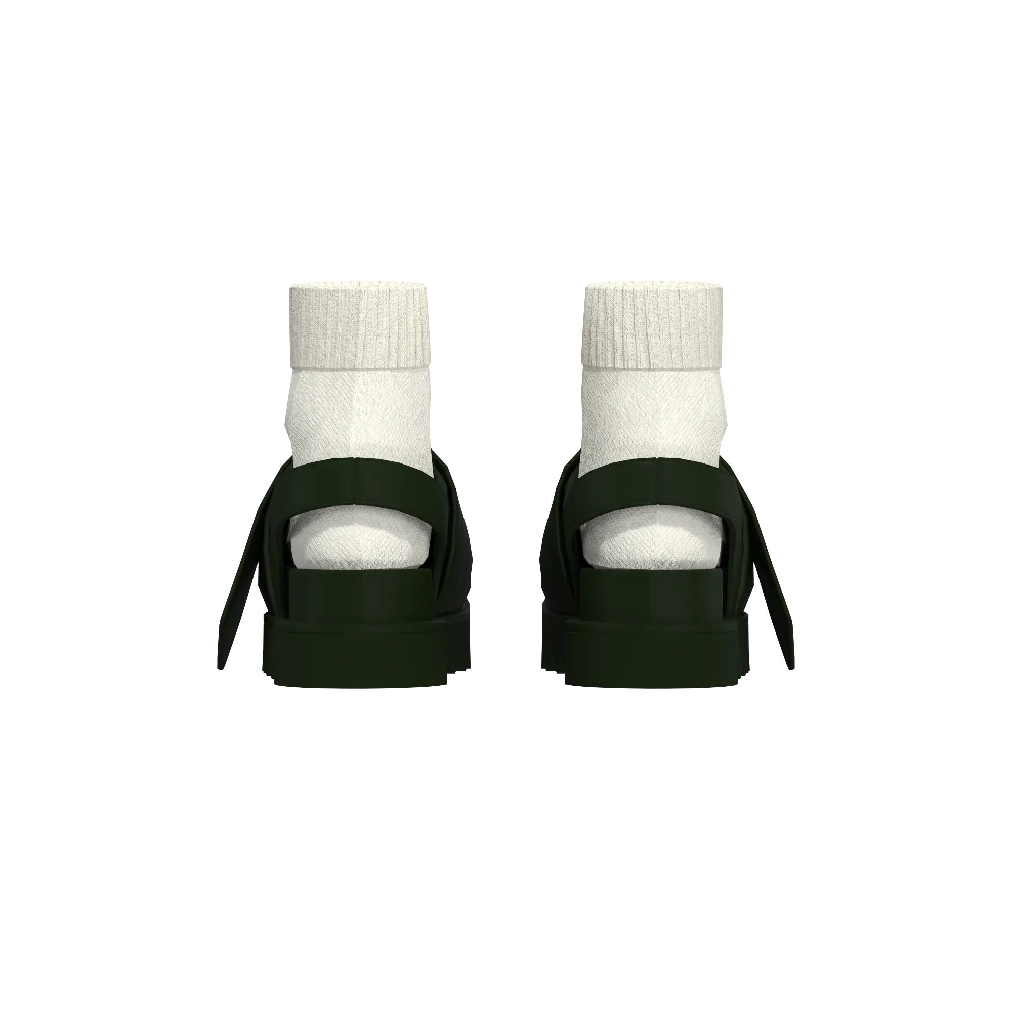アッパーにレザーを使用し、ショートパンツと同じデザインを採用したベルテッドサンダル。くるぶし丈のショートソックス付き。