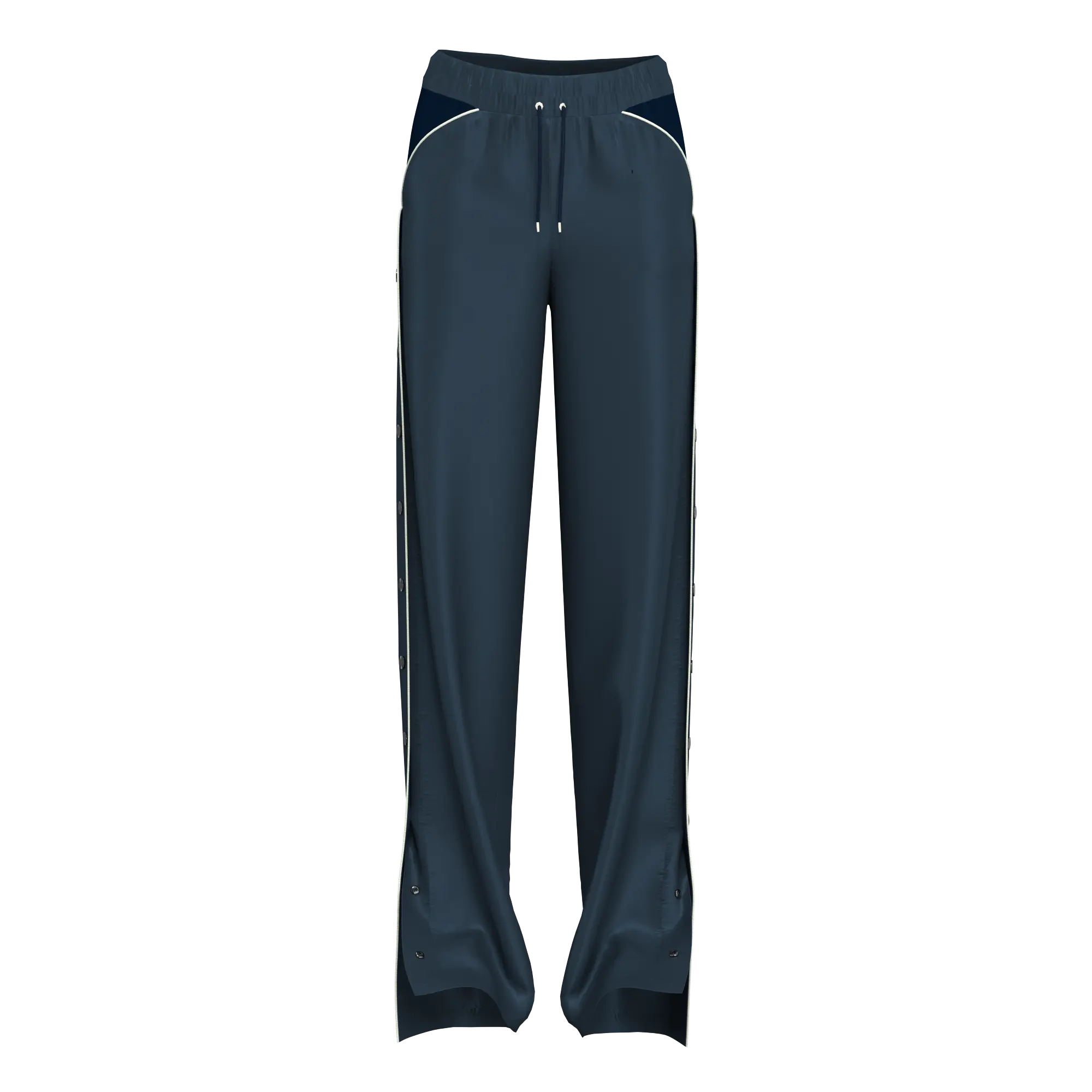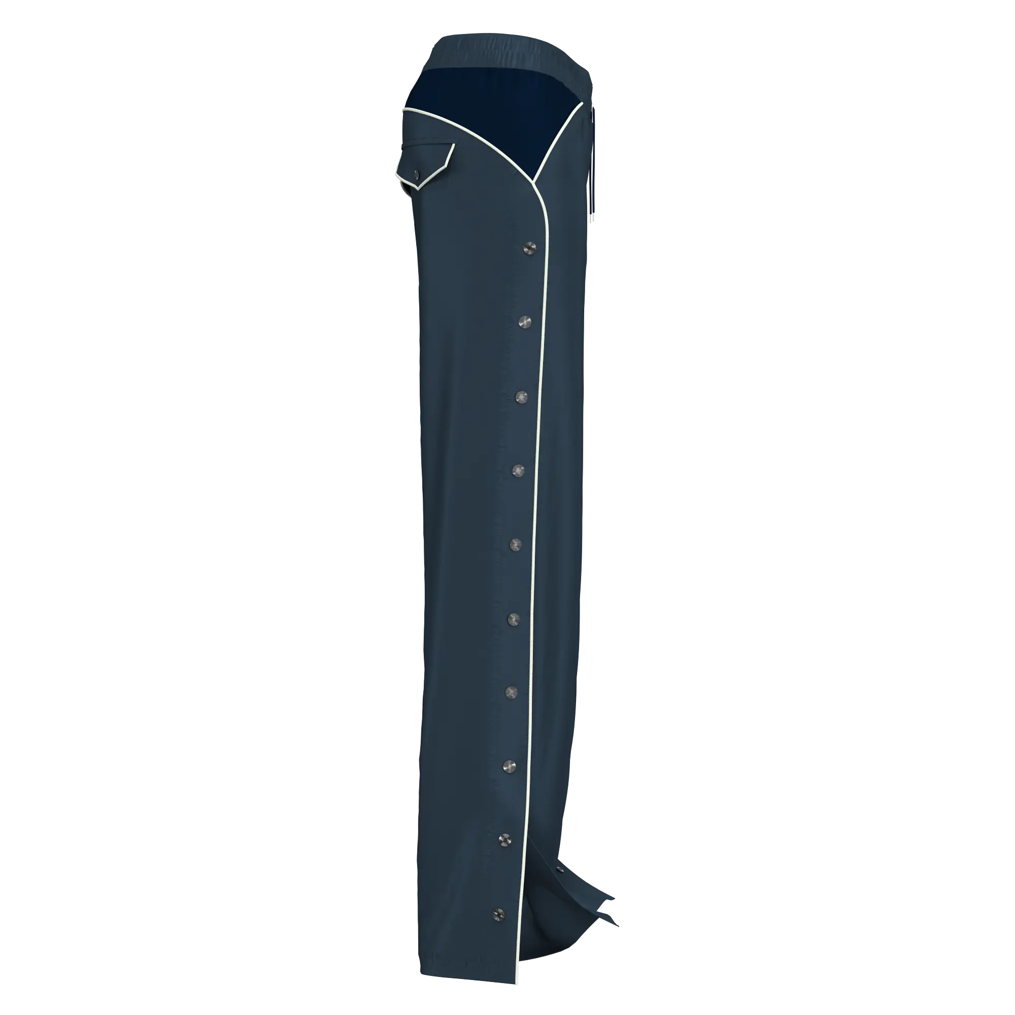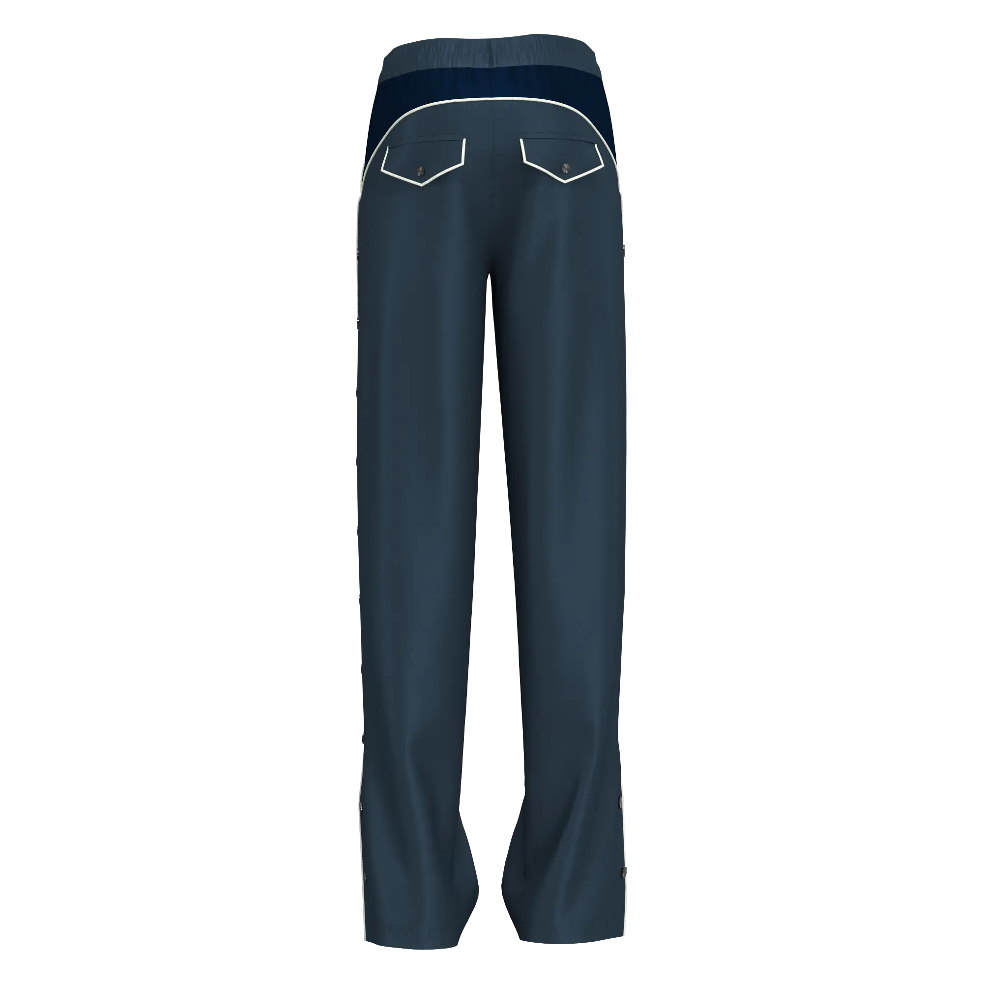 バスケットジャージーのディテールを採用し、ブルーとネイビーのバイカラーに白のパイピングが効いたトラックパンツ。