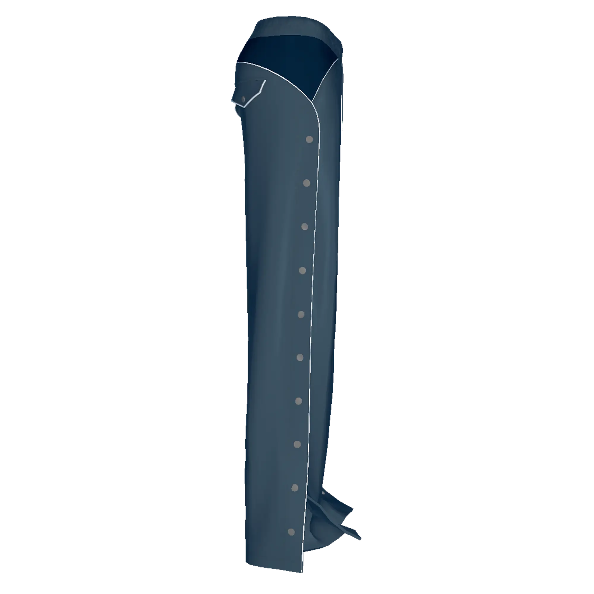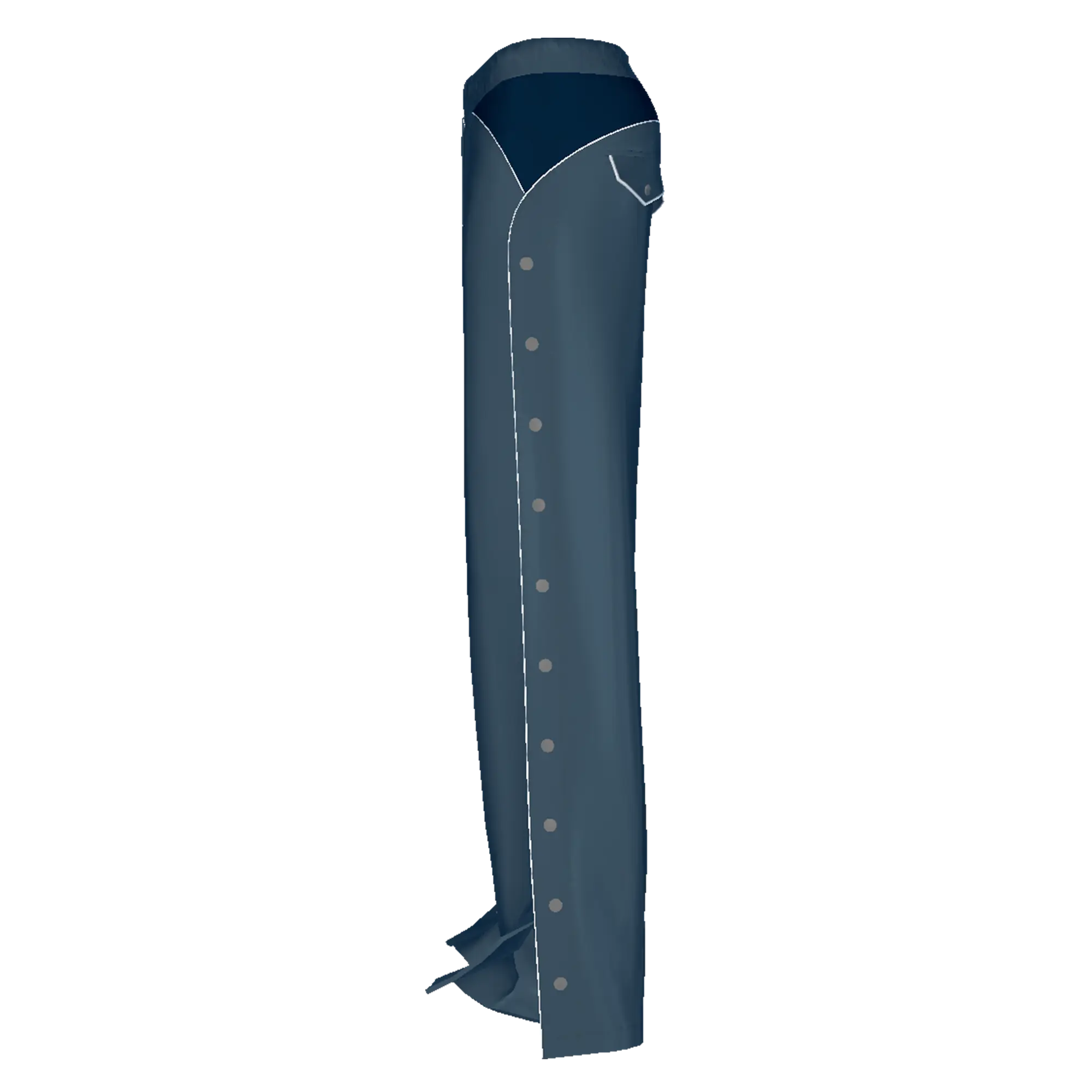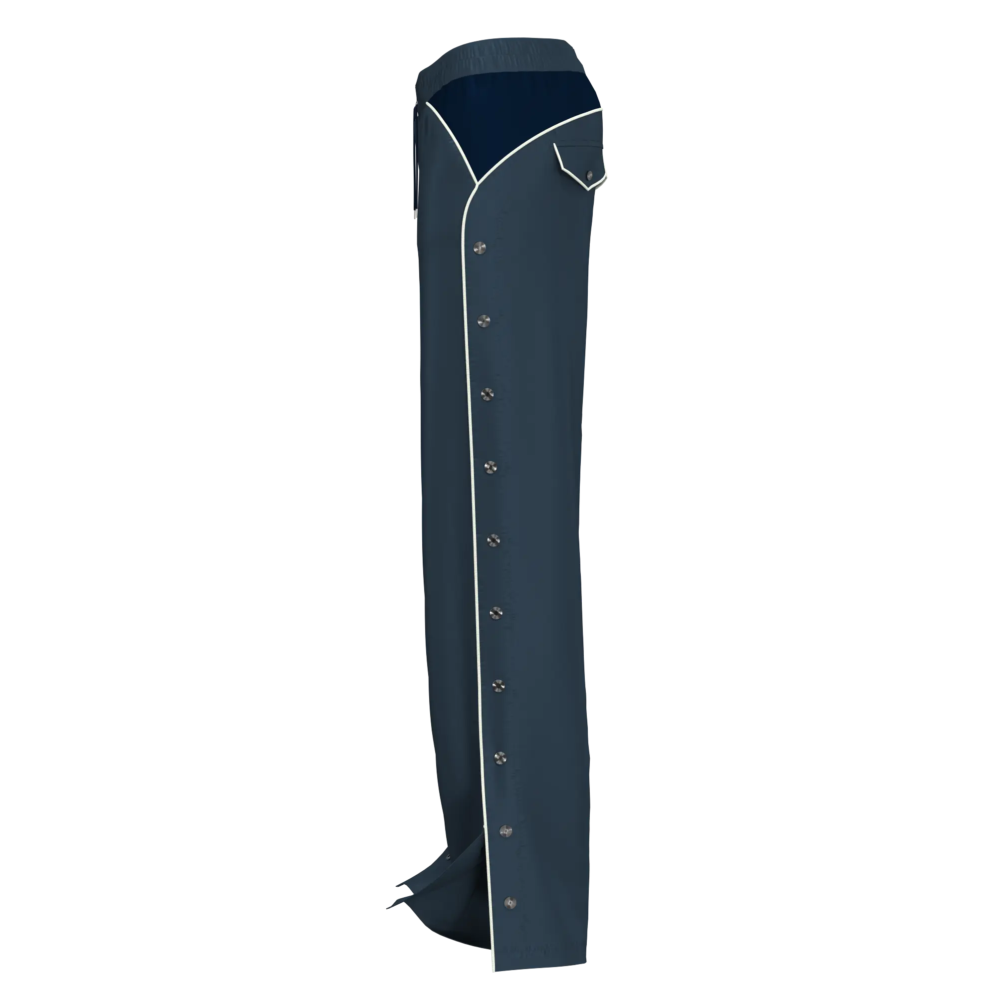バスケットジャージーのディテールを採用し、ブルーとネイビーのバイカラーに白のパイピングが効いたトラックパンツ。