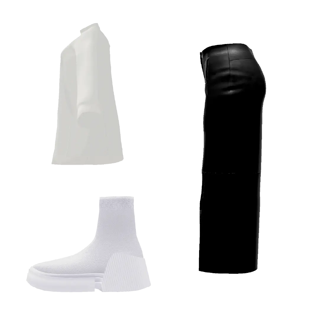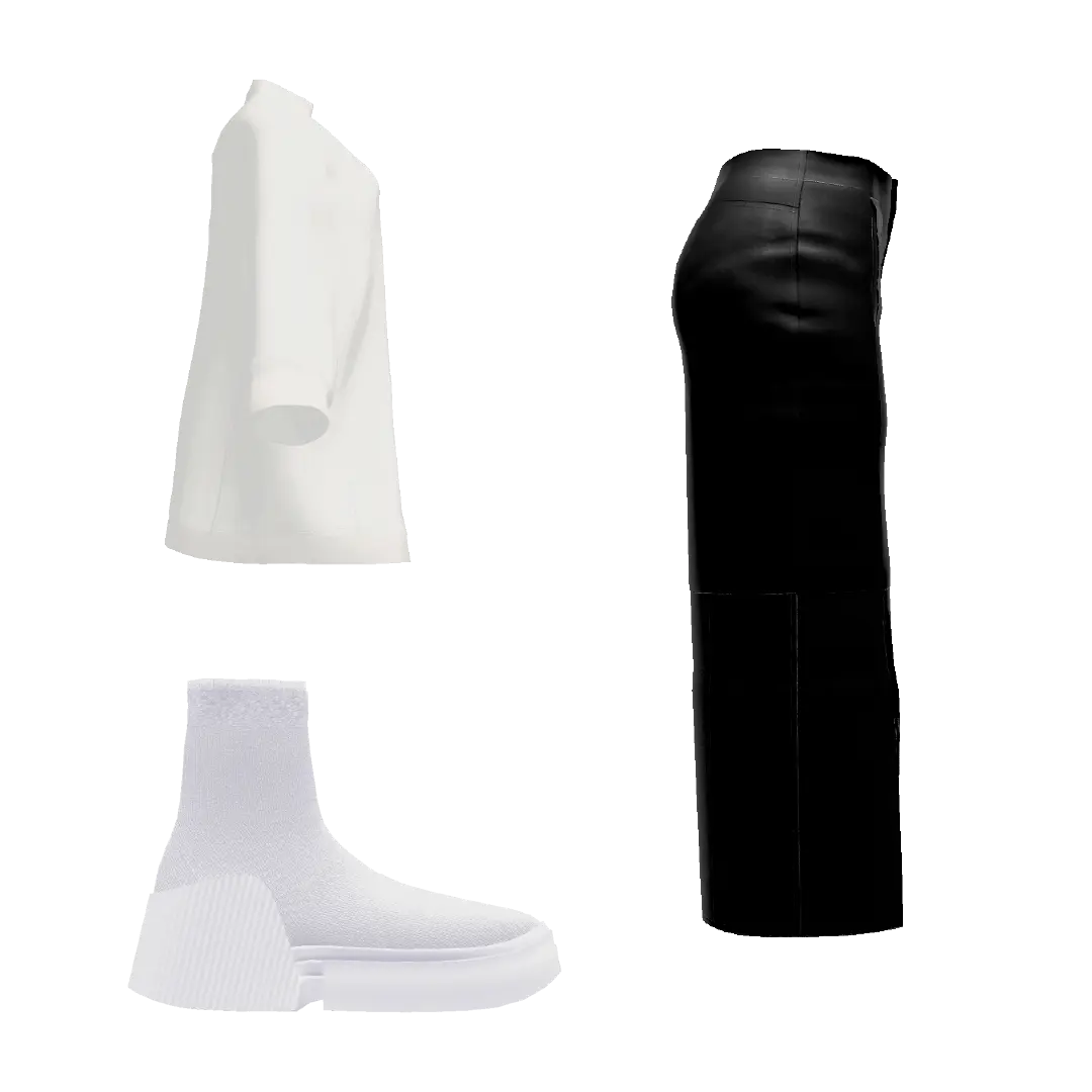 モックネックのプルオーバーにレザースカート・ソックスブーツを合わせたソリッドなモノクロームスタイル。オーバーサイズのトップスとタイトスカートのコントラストも効いたスタイリング。