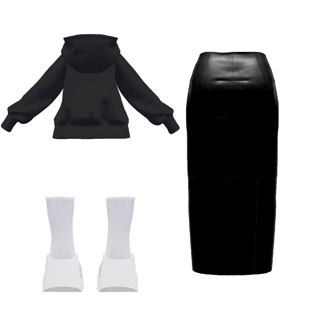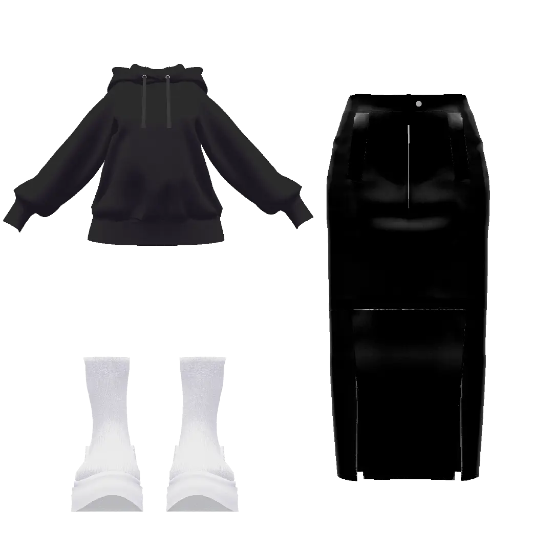 オールブラックのベーシックパーカーとレザースカートにアクセントでホワイトのソックスブーツを差し込んだソリッドスタイル。