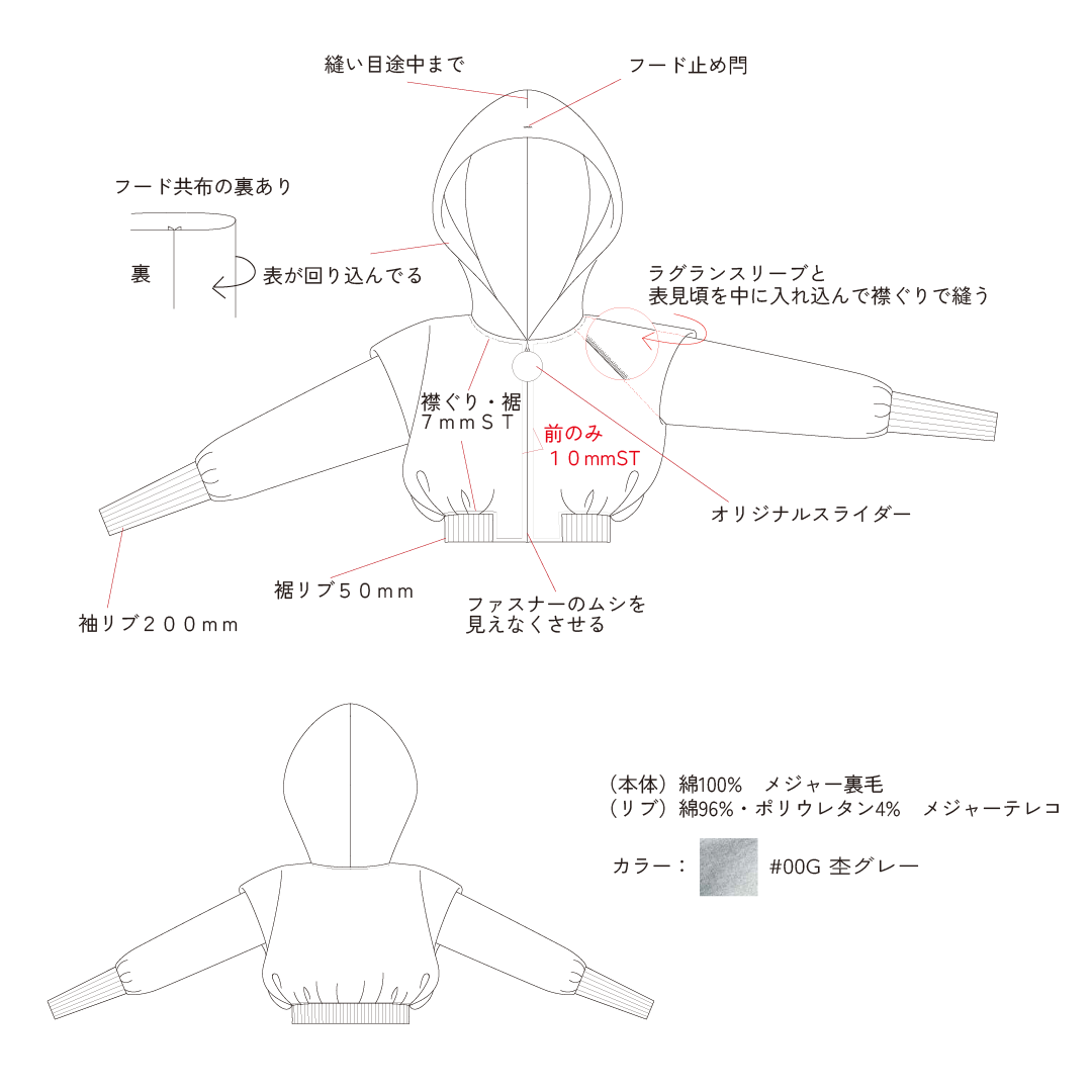 立体的な肩のデザインが印象的な、ラグランスリーブのジップアップパーカ。